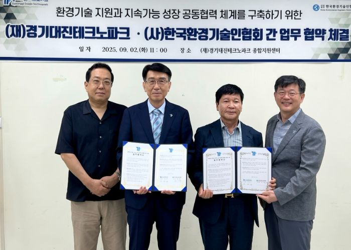 (뉴스폼) (재)경기대진테크노파크와 (사)한국환경기술인협회는 9월 2일 (재)경기대진테크노파크에서 환경기술 지원과 지속가능 성장 공동협력 체계를 구축하기 위한 업무협약을 체결했다.
