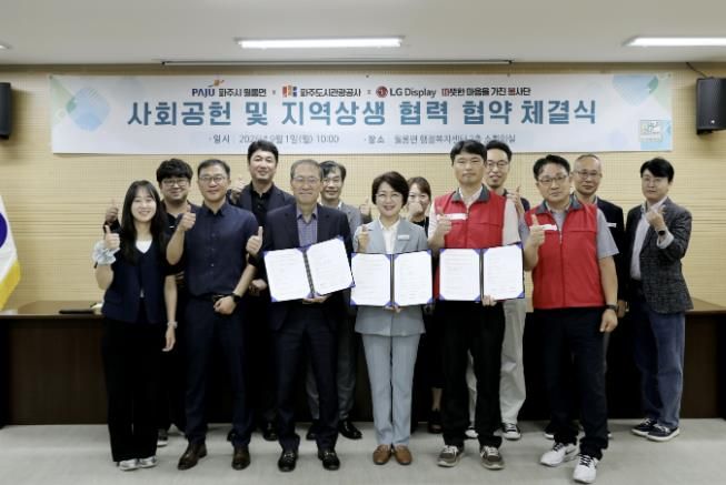 (뉴스폼) 파주도시관광공사는 지난 9월 1일 파주시 월롱면 행정복지센터 2층 소회의실에서 월롱면과 LG디스플레이 직원들로 구성된 봉사단 따봉(따뜻한 마음을 가진 봉사단)과 지역 상생협력 협약(MOU)을 체결했다.