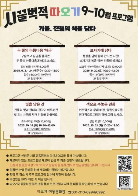 (뉴스폼) 시흥시 따오기아동문화관이 9월부터 10월까지 ‘전통’을 주제로 한 특별ㆍ상설프로그램을 운영한다. 이번 프로그램은 최근 흥행 중인 애니메이션 케이팝 데몬 헌터스의 인기로 높아진 전통문화 관심과 맞물려, 깊어 가는 가을에 아이들과 가족이 함께 우리 문화의 아름다움을 체험할 수 있도록 마련됐다.