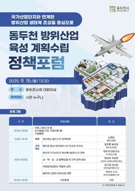 (뉴스폼) 동두천시는 방위산업 육성의 청사진을 마련하기 위한 정책포럼을 오는 9월 15일 오후 1시 30분 시청 대회의실에서 연다고 밝혔다.