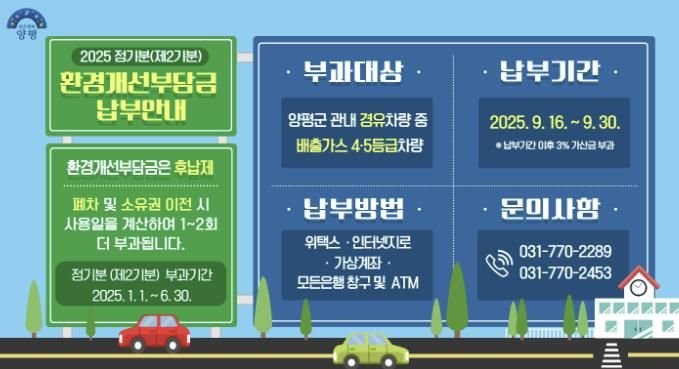 (뉴스폼) 양평군은 2012년 9월 이전에 출고된 노후 경유 자동차(배출가스 4·5등급) 3,825대에 대해 제2기분 환경개선부담금 1억 2,740만 원을 부과한다고 밝혔다.