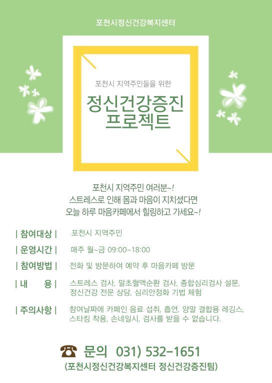 (뉴스폼) 포천시는 지난 12일 포천시정신건강복지센터와 함께 시민들의 정신건강 증진과 스트레스 조기 관리를 위해 ‘마음카페’를 운영하고 있다고 밝혔다.