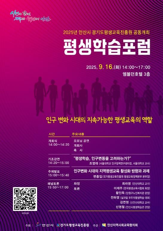 (뉴스폼) 경기도평생교육진흥원은 16일 안산 엠블던호텔에서 안산시와 공동으로 ‘인구 변화 시대의 지속가능한 평생교육의 역할’을 주제로 평생학습포럼을 열었다.