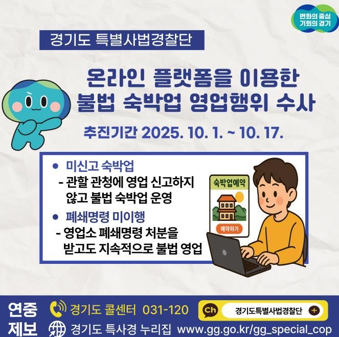 (뉴스폼) 경기도가 10월 1일부터 17일까지 3주간 온라인 공유 숙박 플랫폼을 이용해 오피스텔 등에서 불법 숙박업을 운영하는 미신고 업소를 집중 단속한다.