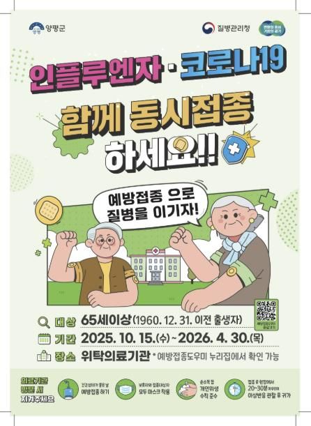 전진선 양평군수는 “예방접종은 감염병을 예방하는 가장 효과적인 방법으로, 특히 독감 유행 전에 접종을 완료하는 것이 중요하다”며, “면역력이 약한 어르신들을 비롯한 군민들께서 적극적으로 예방접종에 참여하시어 건강하고 따뜻한 겨울을 보내시길 바란다”고 말했다.