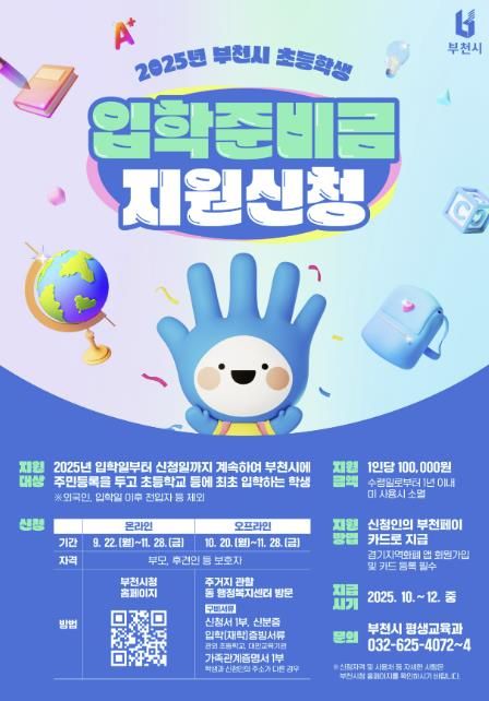 (뉴스폼) 부천시는 2025학년도 초등학교에 입학한 신입생을 대상으로, 가정의 교육비 부담을 덜고 원활한 학교생활 적응을 돕기 위해 1인당 10만 원의 입학준비금을 부천페이로 지급한다고 밝혔다.