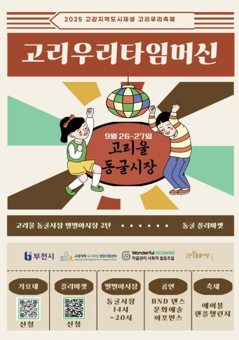 (뉴스폼) 부천시는 9월 26일부터 27일까지 이틀간 오정구 고리울 동굴시장에서 ‘2025 고리우리축제’를 연다고 23일 밝혔다. 이번 행사는 부천시 원도심재생과가 주최하고 원더풀고강마을관리 사회적협동조합이 주관한다.