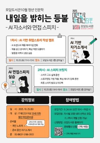 (뉴스폼) 김포시 모담도서관에서 생성형 인공지능을 활용해 자기소개서 및 면접 스피치를 준비해볼 수 있는 청년 대상 프로그램을 10월 25일 오전 11시부터 총 2차시에 걸쳐 운영한다.