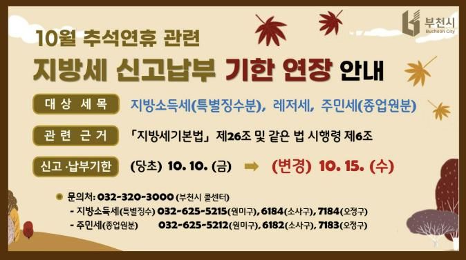 (뉴스폼) 부천시는 긴 추석 연휴로 인해 시민들이 지방세를 기한 내에 신고·납부하는 데 불편을 겪을 것으로 예상됨에 따라, 10월 납부 대상인 지방세 3종의 신고·납부 기한을 기존 10일에서 15일로 5일 연장한다고 밝혔다.