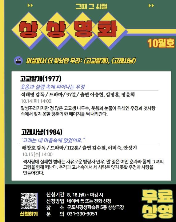 (뉴스폼) 군포문화재단 군포시평생학습원은 시민들의 문화 향유와 세대 공감을 위해 오는 10월 14일과 15일 상상극장에서 고전 영화 상영 프로그램 〈상상명화〉를 운영한다. 이번 상영작은 ‘고교얄개’와 ‘고래사냥’으로 무료 상영된다.