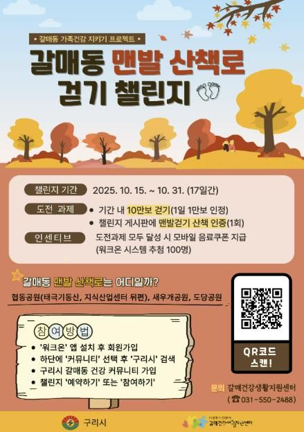 (뉴스폼) 구리시는 가을철 주민들의 건강한 생활 습관 형성과 스트레스 완화를 위해 ‘갈매동 맨발 산책로 걷기 챌린지’를 오는 10월 15일부터 31일까지 17일간 운영한다고 밝혔다.