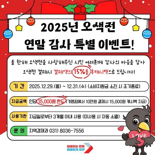 (뉴스폼) 오산시는 한 해 동안 지역화폐를 이용해 준 시민들에게 감사의 뜻을 전하고, 연말 소비 활성화를 도모하기 위해 ‘2025년 오색전 연말 감사 특별 이벤트’를 추진한다.