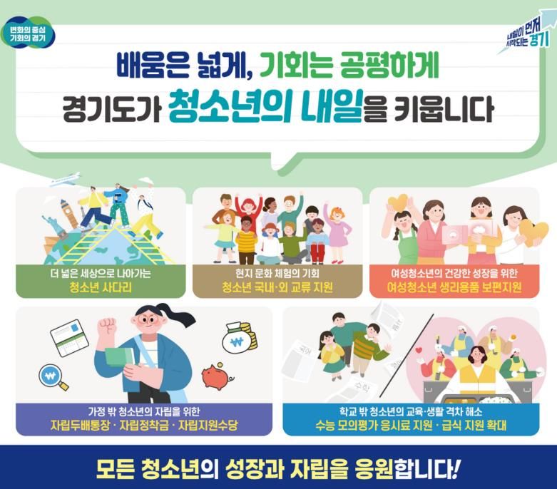 (뉴스폼) 경기도가 청소년의 건강한 성장과 배움 기회, 생활 안정을 위해 급식, 학습·진로·자립 지원까지 아우르는 다양한 정책을 추진한다.