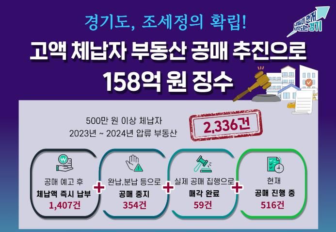 (뉴스폼) 경기도가 2025년 3월부터 11월까지 약 9개월간 부동산 공매를 집중 추진한 결과, 지방세를 체납한 788명으로부터 총 158억 원을 징수했다고 22일 밝혔다.