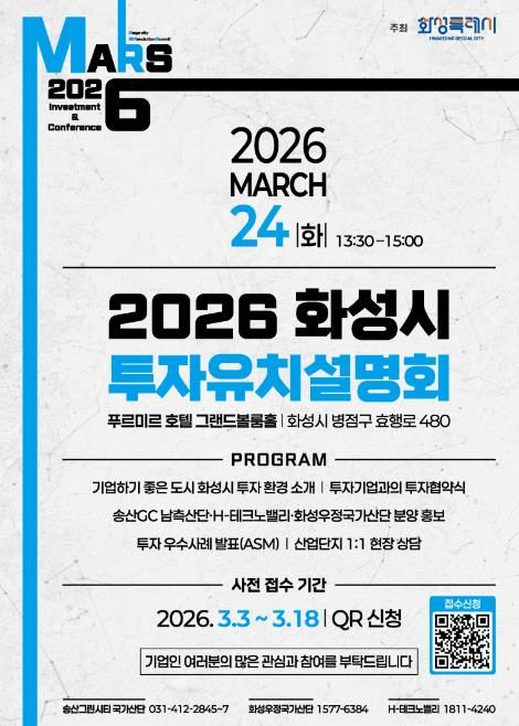 (뉴스폼) 화성특례시가 오는 3월 24일 푸르미르 호텔에서 ‘2026 화성특례시 투자유치 설명회’를 개최하고, 3월 3일부터 3월 18일까지 QR코드를 통한 사전접수를 진행한다.