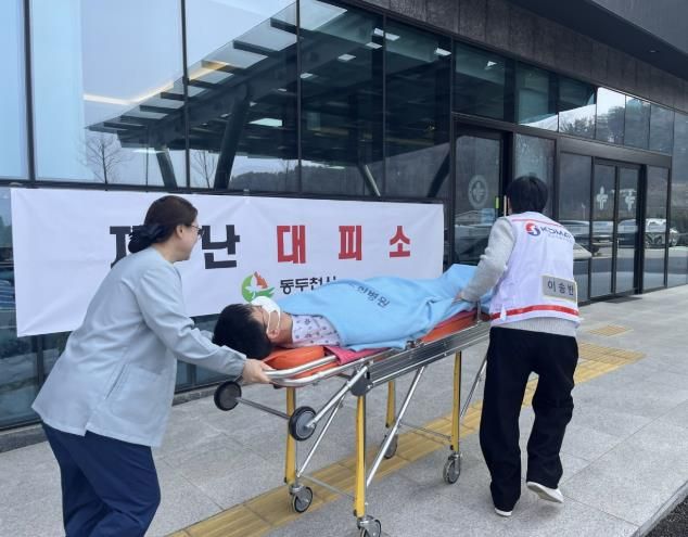훈련 참여자는 와상환자, 거동 가능 환자, 인근 주민 등 총 3개 그룹으로 나뉘어 진행됐으며, 와상환자와 간호 직원은 보건소 구급차를 이용하여 인근 협력 요양병원으로 이송됐다. 거동 가능 환자와 인근 주민들은 병원 승합차와 불현동 관용 차량을 이용하여 대피 지원 인력들과 함께 국민체육센터로 안전하게 대피를 마쳤다.