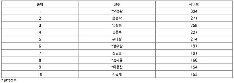 팀 별로는 삼성이 1,374개를 기록해 가장 많은 세이브를 기록했고 LG가 1,278개로 2위, 두산이 1,209개로 뒤를 잇고 있다.