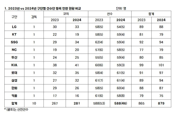 코칭스태프는 지난해 277명에서 14명 증가한 291명이다. KIA는 42명의 코칭스태프를 등록하며 10개 구단 중 유일하게 40명을 넘겼다.