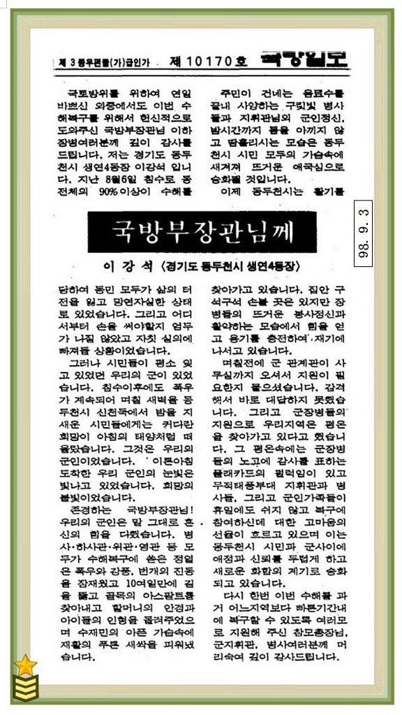 사실 동장발령 반대를 하신 분들도 나중에는 응원군이 되어 주셨습니다. 다시한번 동두천시 수해복구를 위해 애써주신 군부대 장병, 경기도청 공무원, 민간 봉사단체 여러분께 감사드립니다.