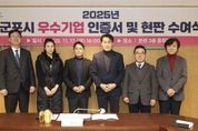 (뉴스폼) 군포시는 17일 시청 3층 중회의실에서 ‘2025년 군포시 우수기업 인증서 및 현판 수여식’을 열고 5개 우수기업에 인증서와 현판을 수여했다. ‘우수기업 선정사업’은 2022년부터 시작하여 올해 4번째로 추진하는 사업으로 일자리 창출, 세수 증대 등 지역경제 활성화에 기여한 기업을 선정하여 인센티브를 부여하는 사업이다. 선정된 우수기업은 인증기간(3년) 동안 군포시 중소기업 육성자금 지원 시 추가 이차보전, 군포시 관내 공영주차장 이용 시 주차요금 감면, 협약병원 의료비 지원 등의 인센티브가 부여된다. 하은호 군포시장은 “어려운 경제 상황 속 관내 우수한 기업에 활력을 불어넣기 위한 우수기업 선정사업에 관심 가져주심에 감사드리며, 앞으로도 기업지원 사업을 다각화하여 기업 경영하기 좋은 환경을 만들겠다”고 말했다. 올해 선정된 군포시 우수기업은 △(주)아이씨에이치 △㈜지비티코리아 △주식회사예선테크 △듀라텍 주식회사 △㈜트리플닷 으로 총 5개 기업이다.