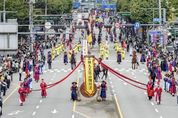 (뉴스폼) ‘K-축제’로 자리매김한 정조대왕 능행차 공동재현이 28일 수원에서 열렸다. 오전에 세차게 비가 내렸지만 수원종합운동장에서 본격적인 행렬이 시작된 오후에는 비가 그쳐 수많은 관람객이 정조대왕 능행차 재현을 함께 즐겼다. 정조대왕 능행차 재현 행렬(수원 구간)은 오전 노송지대(1구간)에서 시작됐다. 오후 3시 30분 수원종합운동장에서 행렬이 출발했고, 종합운동장에서 행궁광장에 이르는 길 양쪽은 관람객들로 가득했다. 시민 2000여 명과 말 70여 필이 행렬에 참여했다. 행궁광장에서 정조대왕이 입궁하는 퍼포먼스로 능행차 공동재현은 마무리됐다. 행궁광장에서는 국제자매도시 공연단의 축하공연, 정조대왕 행차를 환영하는 축하행렬인 수원화성 퍼레이드, 정조대왕 능행차 재현·입궁 퍼포먼스, KBS 국악관현악단과 국악인 김영임, 유태평양의 협연 콘서트가 이어졌다. 이재준 수원시장, 이재식 수원시의회 의장, 수원 지역 국회의원들도 행렬에 참여하며 시민들과 함께했다. 행궁광장에서 시민들을 만난 이재준 시장은 “수많은 시민이 함께 즐긴 정조대왕 능행차 공동재현은 정조대왕이 꿈꿨던 여민동락(與民同樂