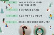 (뉴스폼) 김포시 풍무도서관은 ‘사서와 함께하는 크리스마스 책놀이’프로그램을 12월 9일과 16일 오후 3시부터 4시 30분까지 운영한다. ‘사서와 함께하는 크리스마스 책놀이’는 풍무도서관 사서가 직접 운영하는 프로그램으로, 크리스마스를 주제로 한 도서를 함께 읽고 크리스마스 소품 만들기 활동을 통해 창의력과 표현력을 기를 수 있도록 구성됐다. 크리스마스 주제 도서로 ‘산타 할아버지의 첫 크리스마스’(맥 바넷 지음)와 ‘크리스마스에는 축복을’(김현철 지음)을 활용하고, 트리 장식 및 스노우볼 오너먼트 등 크리스마스 소품 만들기 시간을 가질 예정이다. 11월 25일 오전 10시부터 풍무도서관 홈페이지에서 참여 신청할 수 있으며, 김포시 관내 아동 5~7세 12명을 선착순으로 모집한다.
