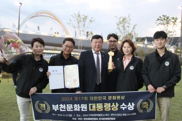 (뉴스폼) 부천문화원이 지난달 27일 오후 6시 부산항 북항 친수공원에서 열린 ‘2024 지역문화박람회 in 부산’ 개막식에서 창립 58년 만에 대한민국 문화원상 대상(대통령) 수상 쾌거를 달성했다.