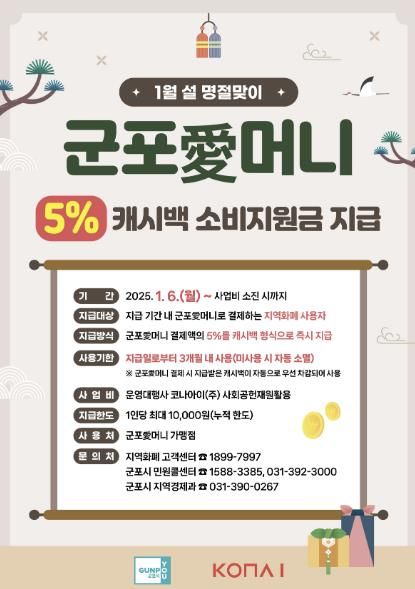(뉴스폼) 군포시와 지역화폐 운영대행사 코나아이(주)는 설 명절을 맞아 오는 1월 6일부터 군포愛머니 사용자들에게 결제금액의 5%를 캐시백으로 지급하는 소비지원금 이벤트를 진행한다.