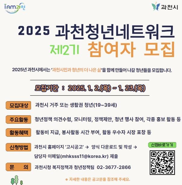 (뉴스폼) 과천시가 청년의 목소리를 시정에 반영하기 위해 ‘과천청년 네트워크 2기’ 위원을 오는 1월 23일까지 모집한다고 밝혔다.