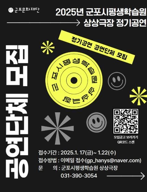 (뉴스폼) 군포문화재단 군포시평생학습원은 이달 22일까지 2025년 상상극장에서 정기공연을 진행할 공연단체를 공개 모집한다.