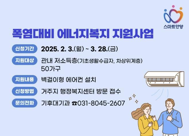(뉴스폼) 안양시는 다가오는 여름철 폭염에 대비해 저소득가구를 대상으로 ‘2025년 폭염 대비 에너지복지 지원사업’을 추진하고 다음 달 28일까지 대상자 신청을 받는다고 3일 밝혔다.