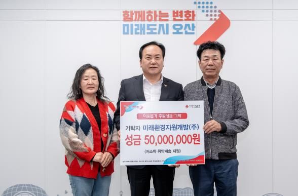 (뉴스폼) 오산시는 지난 1일 미래환경자원개발(주)으로부터 지역 내 저소득층을 위한 성금 5천만 원을 기탁받았다고 밝혔다.