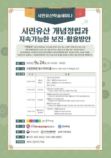 (뉴스폼) 경기문화재단은 오는 10월 24일 오후 2시, 수원문화원 빛누리아트홀에서 ‘시민유산 개념정립과 지속가능한 보전·활용방안’ 학술 세미나를 개최한다고 밝혔다. 세미나는 문화유산을 소수 전문가의 영역에서 시민 모두의 유산으로 확장하고, 그 가치를 지속가능하게 보전, 활용하는 방안을 모색하기 위해 기획됐다.
