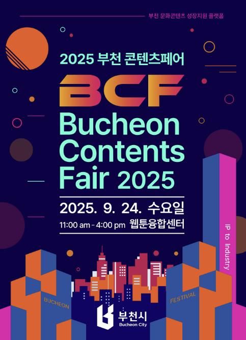 (뉴스폼) 부천시는 9월 24일 오전 11시 웹툰융합센터에서 ‘2025 부천 콘텐츠페어’를 연다. 이번 행사는 ‘From IP to Industry’를 주제로 우수 콘텐츠 지식재산권(IP)의 비즈니스 확장, 투자유치, 판로개척을 지원하기 위해 마련됐다.