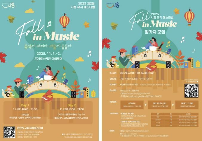 (뉴스폼) 시흥시는 오는 11월 1일부터 2일까지 시흥 은계호수공원에서 ‘2025년 제2회 시흥뮤직페스티벌’ 개최를 앞두고 참가팀을 모집한다. 올해 페스티벌 주제는 ‘시흥 Fall in Music -음악에 빠지다, 가을에 물들다- ’로 ‘가을’을 주제로 한 다양한 장르의 전국 단위 음악경연대회 및 축하공연으로 꾸며진다.