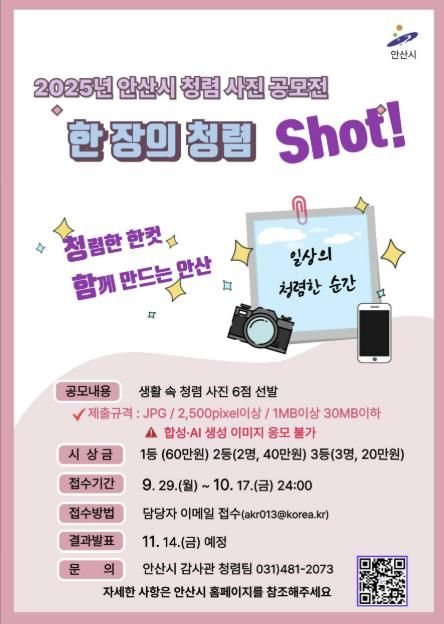 (뉴스폼) 안산시는 청렴문화 확산과 시민 공감대 형성을 위해 ‘2025 한 장의 청렴, Shot! 사진 공모전’을 개최한다고 30일 밝혔다.