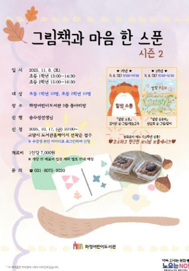 (뉴스폼) 고양특례시 화정어린이도서관은 오는 11월 8일 ‘고소하고 향긋한 보늬밤 보틀케이크’를 만들어보는 그림책 동화요리 프로그램‘그림책과 마음 한 스푼-시즌2’를 운영한다.