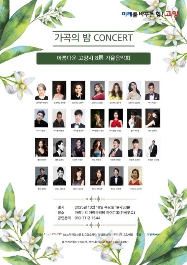 (뉴스폼) 고양특례시가 후원하고, (사)한국예술문화단체총연합회 고양지회가 주최하며 (사)한국음악협회 고양지부가 주관하는 ‘2025 가곡의 밤 – 아름다운 고양시 8경(景) 가을 음악회’가 오는 16일 오후 7시 30분, 고양아람누리 아람음악당에서 개최된다.