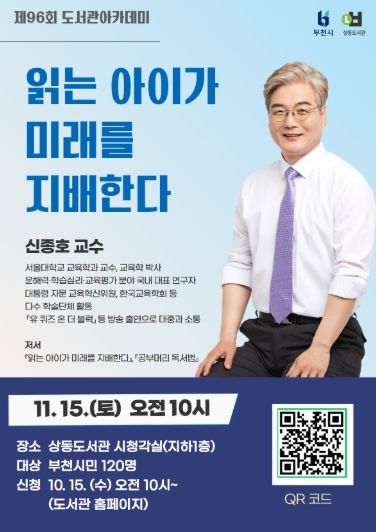 (뉴스폼) 부천시는 11월 15일 오전 10시 부천시립상동도서관 시청각실에서 인공지능(AI)·디지털 시대 학습 경쟁력의 핵심인 문해력을 주제로 ‘제96회 도서관 아카데미’를 연다. 이번 강연은 ‘읽는 아이가 미래를 지배한다’의 저자이자 서울대학교 교육학과 교수인 신종호 교수를 초청해 진행한다.