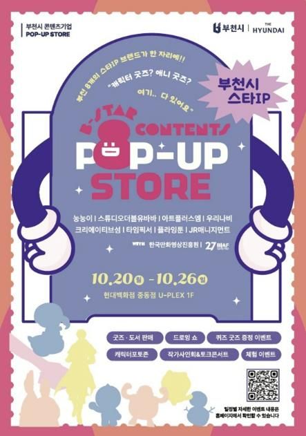 (뉴스폼) 부천시는 10월 20일부터 26일까지 현대백화점 중동점 U-PLEX 1층에서 지역 우수 콘텐츠 기업 8개 사가 참여하는 팝업스토어 ‘8 CONTENTS, ONE STAGE in BUCHEON’을 운영한다.