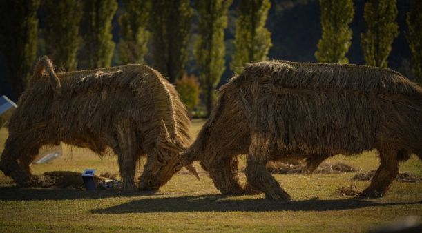 (뉴스폼) 아름다운강천 사회적협동조합은 경기문화재단의 지원을 받아 ‘지붕 없는 박물관’ 사업의 일환으로 2025년 강천섬에 짚으로 만든 황소 조형물 두 건을 설치했다. 이번 작품은 소싸움을 연상시키는 역동적인 구도로 제작되어, 자연 속에서 생동감 넘치는 예술적 장면을 연출했다.