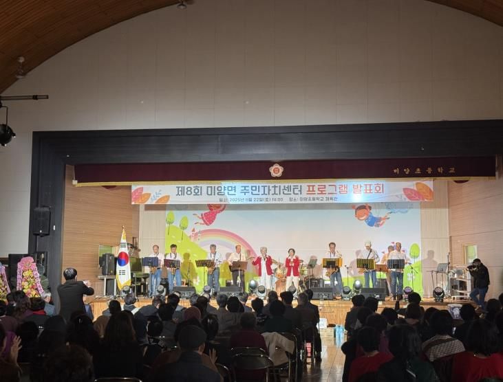 미양면 주민자치위원회가 주관한 이날 발표회는 밴드, 노래, 건강체조, 실버댄스, 몸살림운동, 요가, 민화 7개 프로그램 수강생들이 그동안 갈고닦은 실력을 펼치는 무대 및 전시로 꾸며져 주민들의 뜨거운 호응을 얻었다.