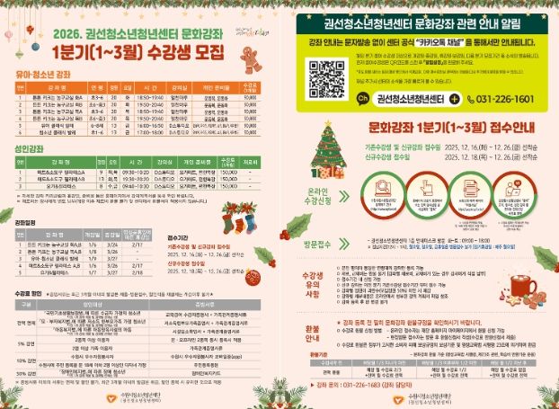 (뉴스폼) 수원시청소년청년재단 권선청소년청년센터는 오는 1월 6일부터 3월 27일까지 지역사회 평생학습 문화강좌 1분기(1~3월) 수강생을 모집한다.