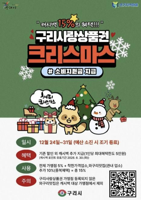 (뉴스폼) 구리시는 12월 24일부터 ‘구리사랑상품권 크리스마스 소비 지원금’을 지급한다고 밝혔다. 이번 소비 지원금은 연말연시 기간 지역 외로 유출되는 소비를 지역 내로 유도하고, 관내 상권 활성화와 소상공인 보호를 위해 마련됐으며, 예산 소진 시 조기 종료될 수 있다.