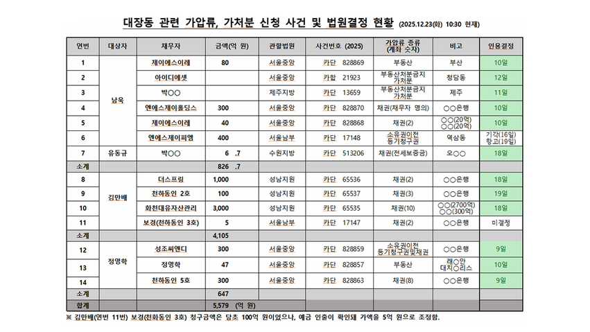 인용 대상은 ▲김만배 3건(4,100억 원) ▲남욱 가처분 2건, 가압류 3건(420억 원) ▲정영학 3건(646.9억 원) ▲유동규 1건(6.7억 원) 등이다.