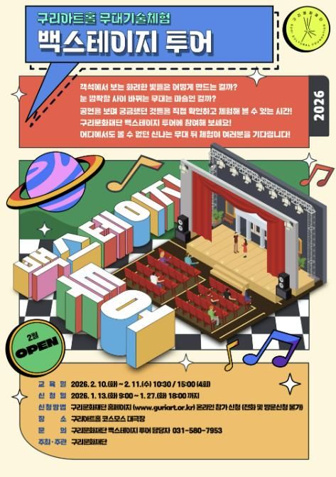 (뉴스폼) 구리문화재단은 〈무대 기술 체험 백스테이지 투어 프로그램〉 참가자를 오는 1월 13일 오전 9시부터 1월 27일 오후 6시까지 재단 홈페이지를 통해 선착순 모집한다고 밝혔다.