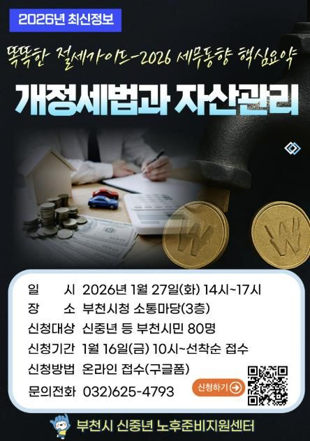 (뉴스폼) 부천시는 1월 27일 시청 3층 소통마당에서 ‘2026년 개정세법과 자산관리’ 재무특강을 진행한다. 이번 특강은 오후 2시부터 5시까지 부천시민 80명을 대상으로 무료로 진행되며, 신중년의 자산관리 역량을 높이고 안정적인 노후설계를 지원하기 위해 마련됐다.