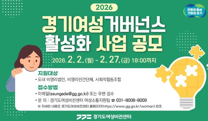 (뉴스폼) 경기도여성비전센터가 오는 2월 27일까지 경기여성거버넌스 활성화 공모사업 수행 단체를 모집한다.