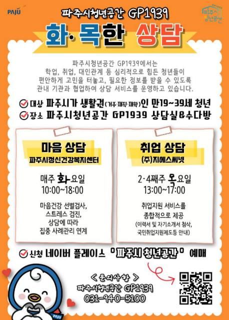 (뉴스폼) 파주시는 청년들의 심리 안정과 취업 역량 강화를 위해 파주시청년공간 지피(GP)1939에서 진행하는 상담 프로그램 ‘화·목한 상담’의 참여자를 모집한다.