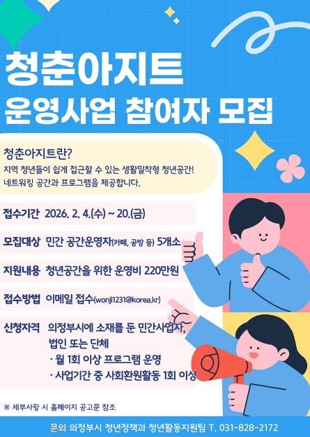 (뉴스폼) 의정부시는 청년들이 일상 속에서 자유롭게 모이고 활동할 수 있도록 생활밀착형 청년공간 ‘청춘아지트’ 사업에 참여할 민간사업자를 모집한다.